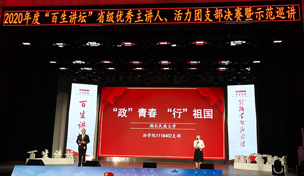 大赛现场本网讯 (通讯员 tw) 12月9日,由共青团湖北省委、湖北省学生联合会主办的2020年度“百生讲坛”省级优秀主讲人、活力团支部决赛暨示范巡讲在中南财经政法大学南湖会堂举行。我校1118402班团支部参加现场决赛,最终获得第二名,并被授予“金牌团支部”荣誉称号。 法学院政治学与行政学专业1118402支部历经层层选拔和遴选,从全省参赛的358个团支部中脱颖而出,入围参加省级决赛暨示范巡讲。活动现场1118402支部通过支部...