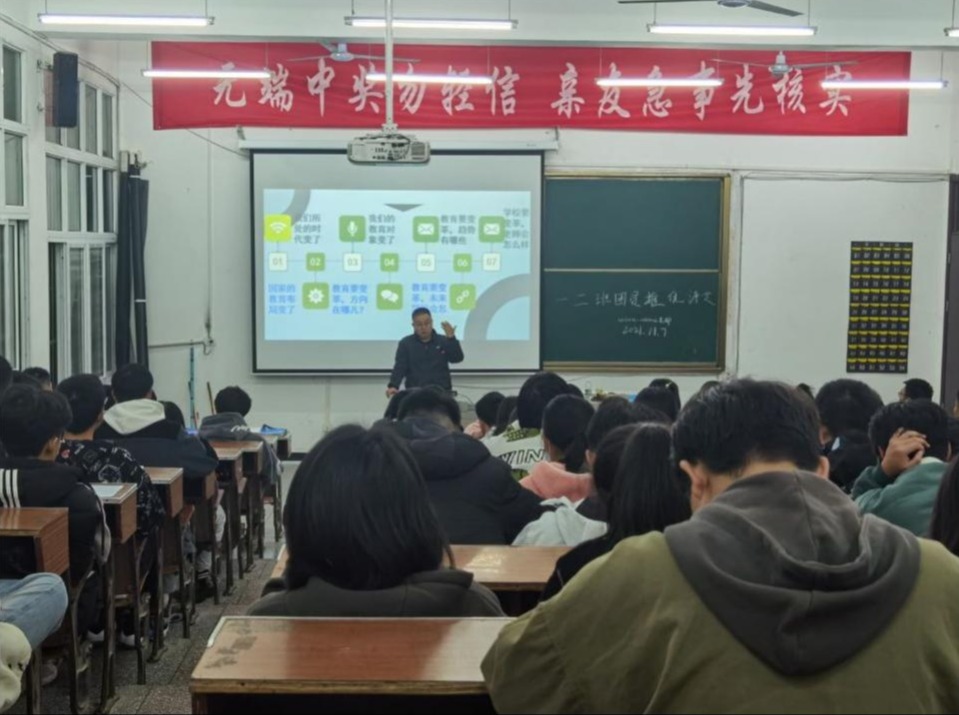 本网讯(见习记者 唐金凤 常京菲 尚者/文 程晋 樊蕙/摄)11月7日晚,我院在3308教室开展以“巨变时代背景下的教育职业思考”为主题的讲座。恩施州优秀教师、优秀班主任杨平老师担任主讲人。学生科黄丽娜老师、廖祥宇老师,数学系主任向中义老师,班主任赵远安老师受邀出席本次讲座。2021级数学与应用数学专业全体学生到场聆听。