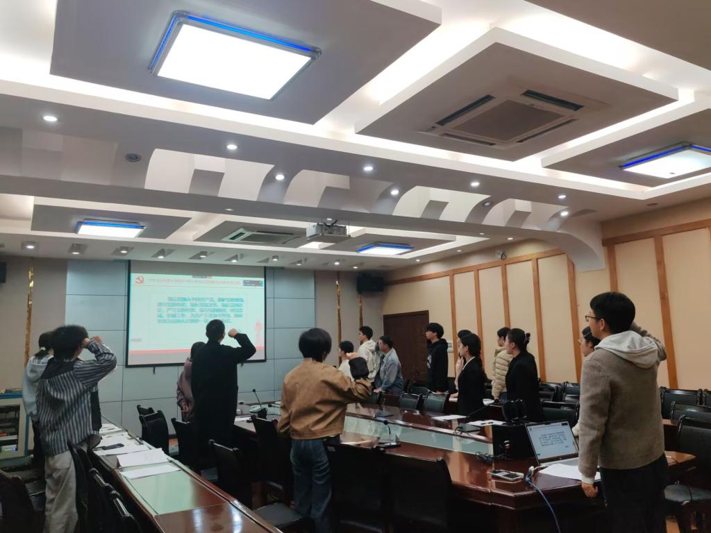 会上,全体党员肃立,在廖祥宇同志的带领下重温了入党誓词。紧接着,陈佳馨同志诵读了《中国共产党章程》第八章第四十五条,详细解读了党的纪律检查机构设置及其职责,使党员们对党的纪律体系有了更深刻的认识,纪律意识和规矩意识得到进一步增强。